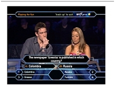 - BskyB 2003년에 개발 사용되었던 퀴즈 어플리케이션의 형태는 사용자들이 메인 쇼의 퀴즈 참여자와 함께 퀴즈 답을 맞힐 수 있도록 고안된 것. 사용자는 리모트콘트롤을 이용하여 번호 (1-4번)를 선택함.